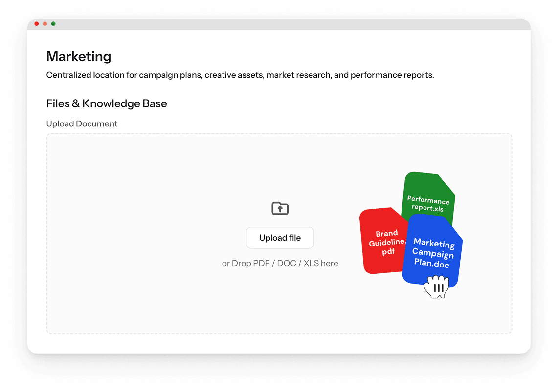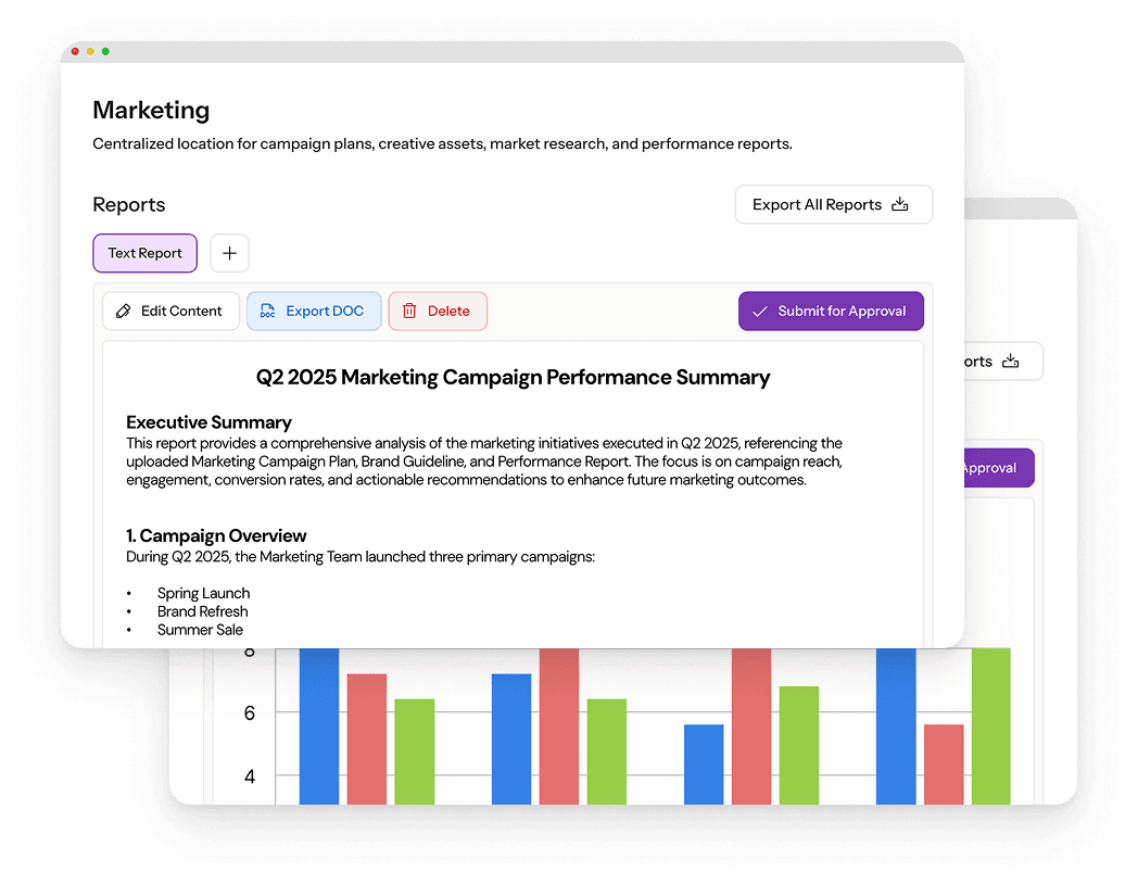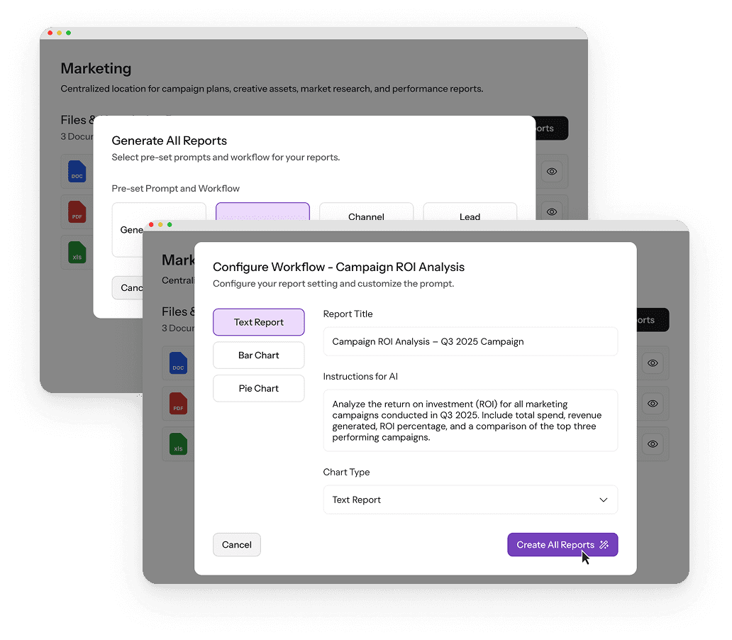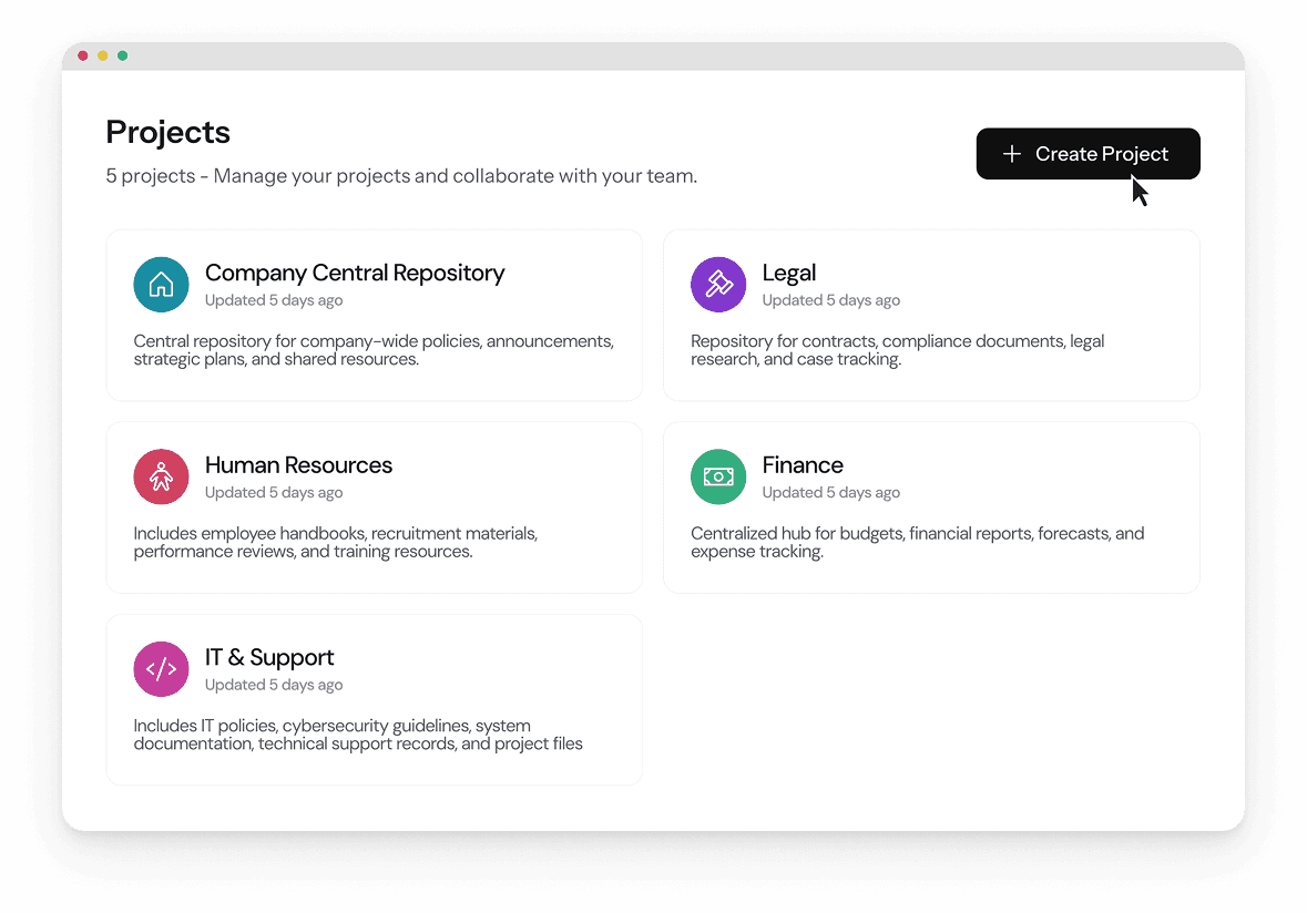 Set up a project workspace dedicated to a team or department. Each one stores documents, chat records, generated reports and charts.