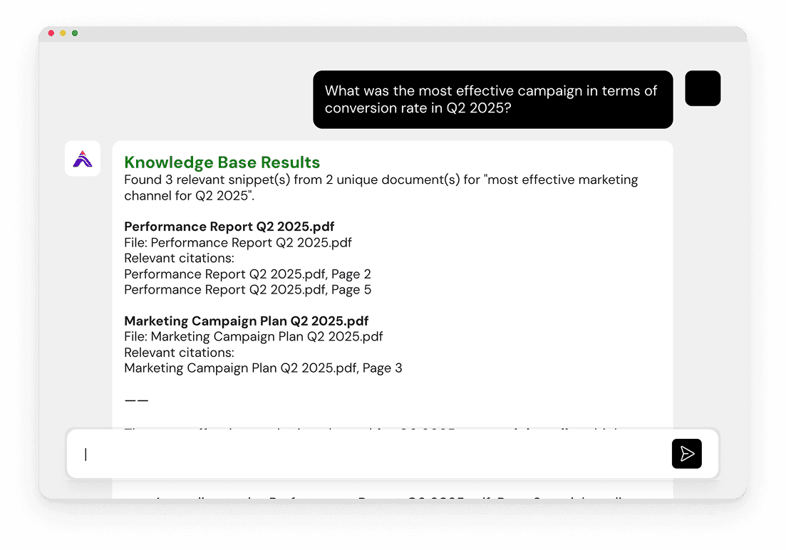 Unlike generic chatbots, Alluvia uses an advanced Retrieval-Augmented Generation architecture, ensuring every AI-generated answer is accurate, traceable, and source‑verified.
