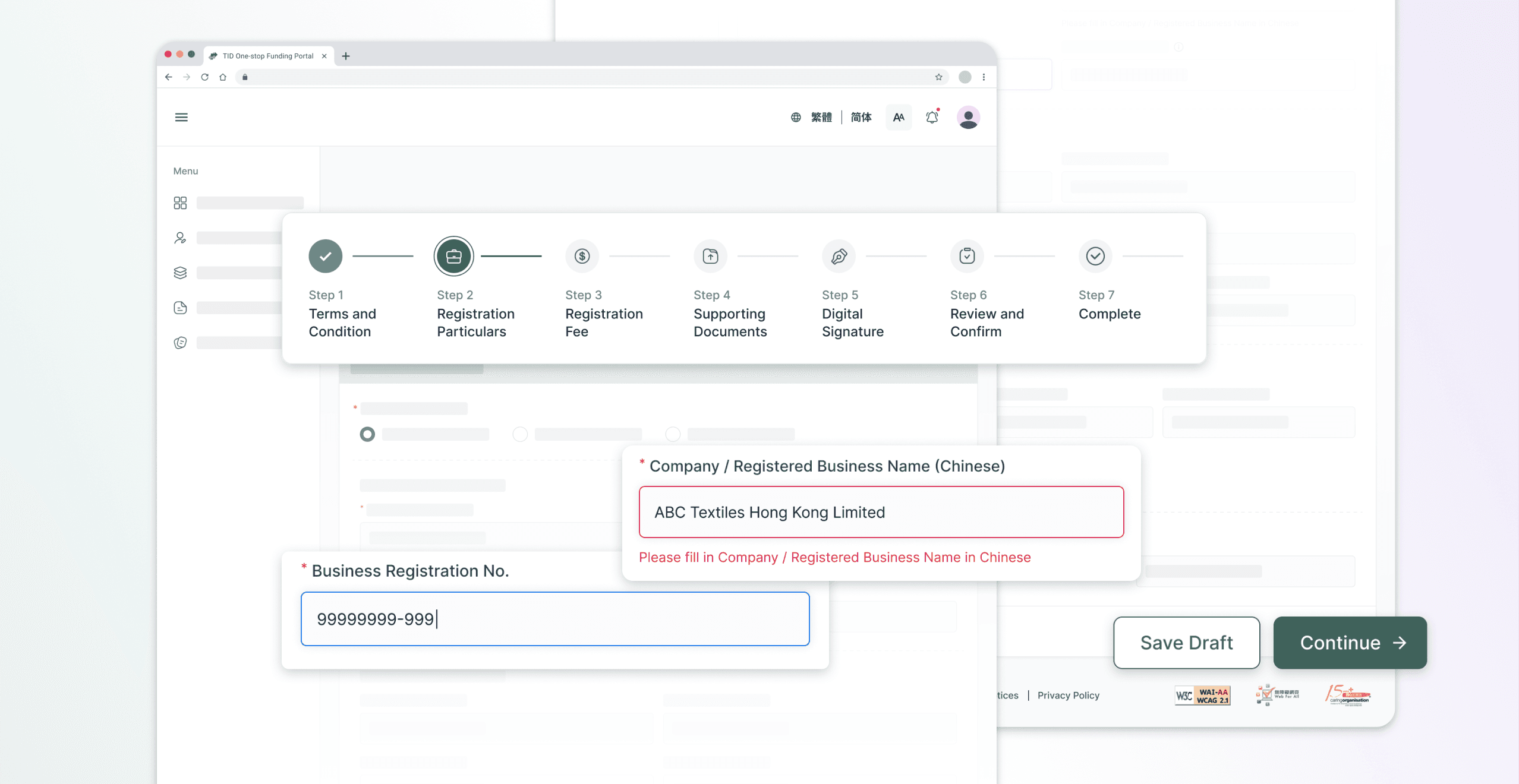 Real-time data validation with error message ensures accurate inputs, stepper provides a clear progress indicator and draft saving allows users to pause and resume applications seamlessly.