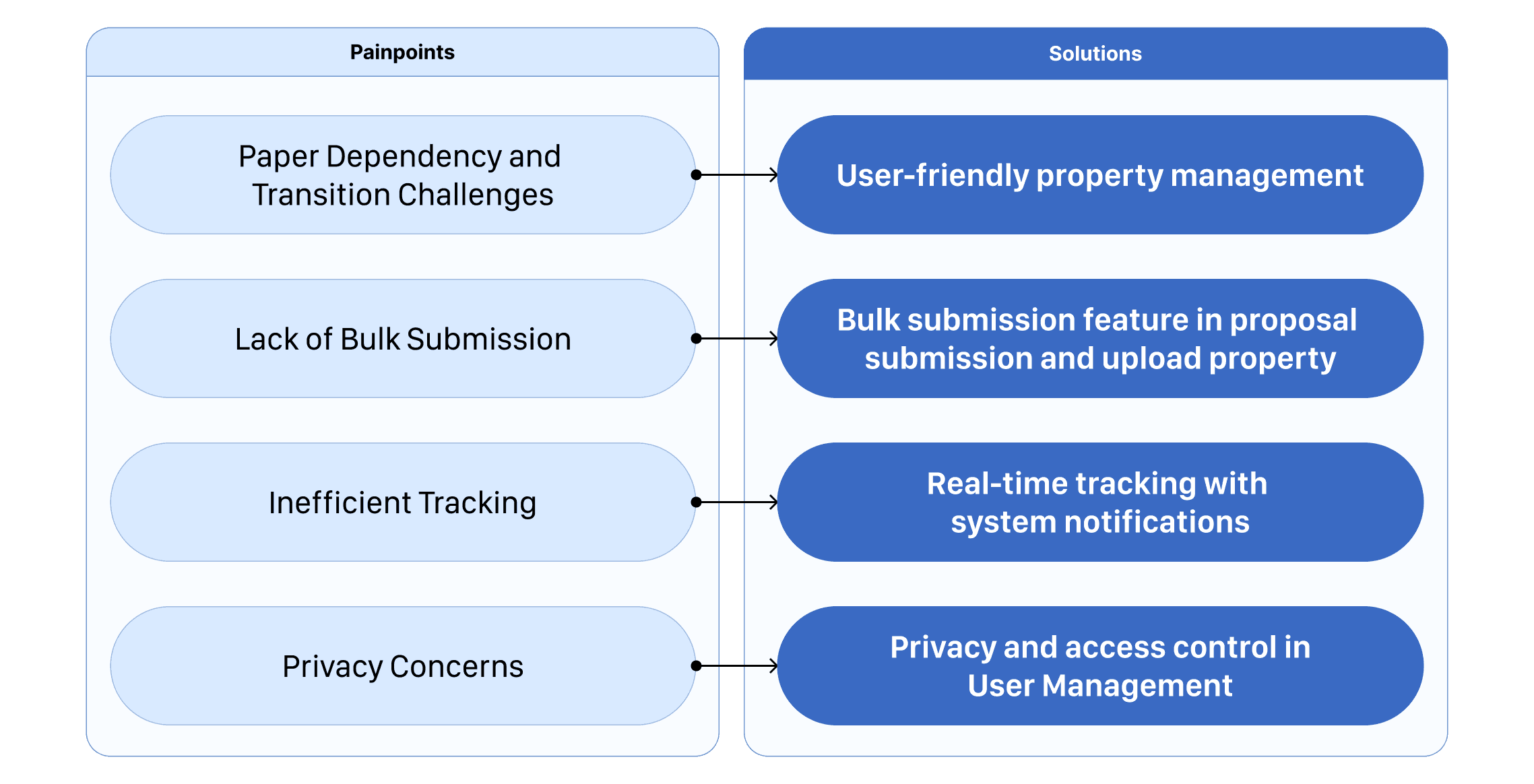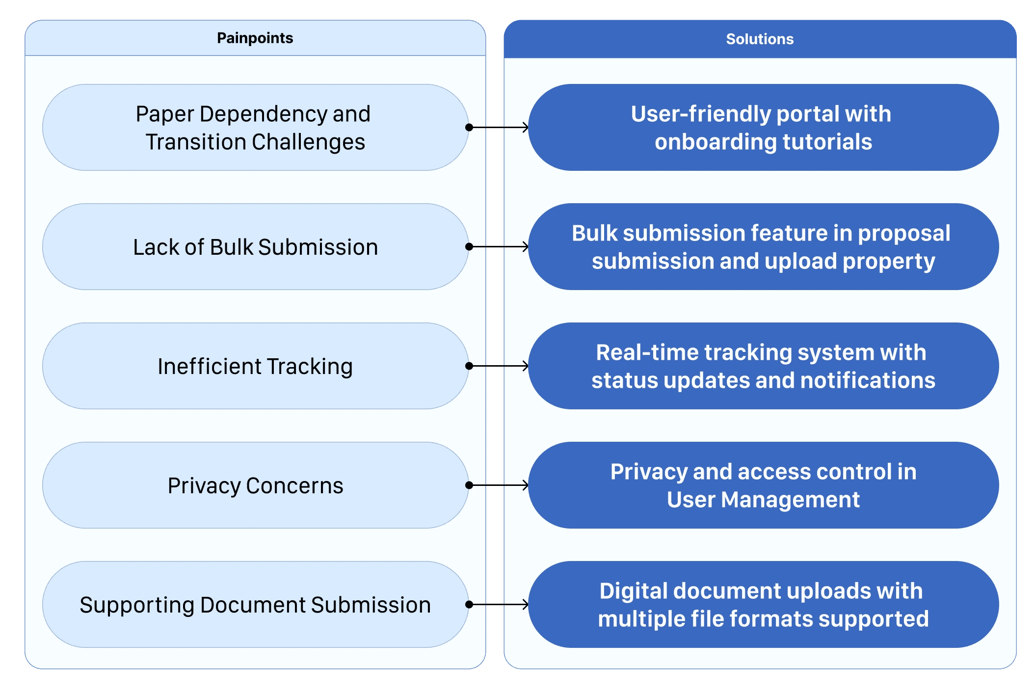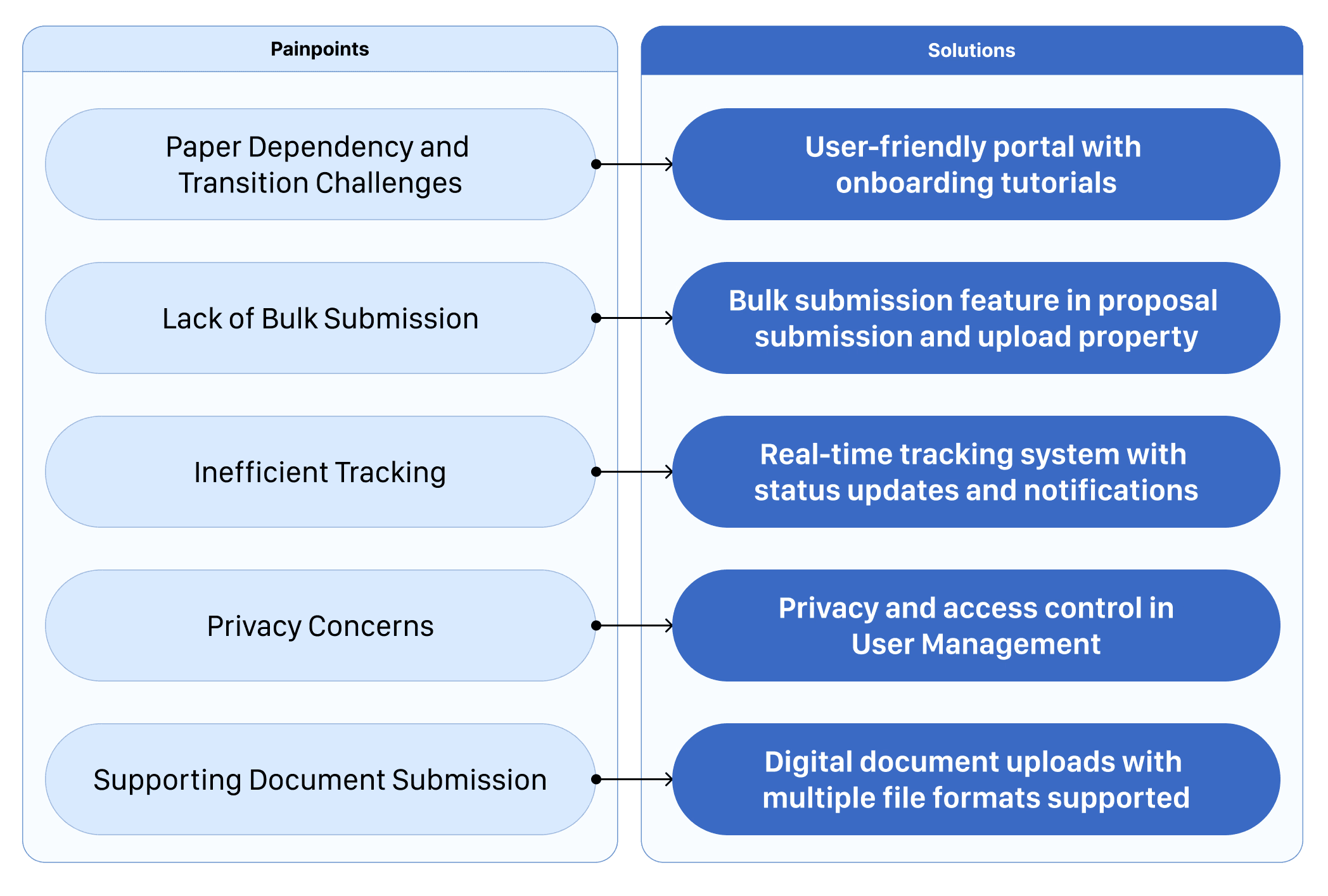 Users relied on phone calls to track proposals currently. A robust tracking system with real-time updates, notifications, and submission history is suggested.