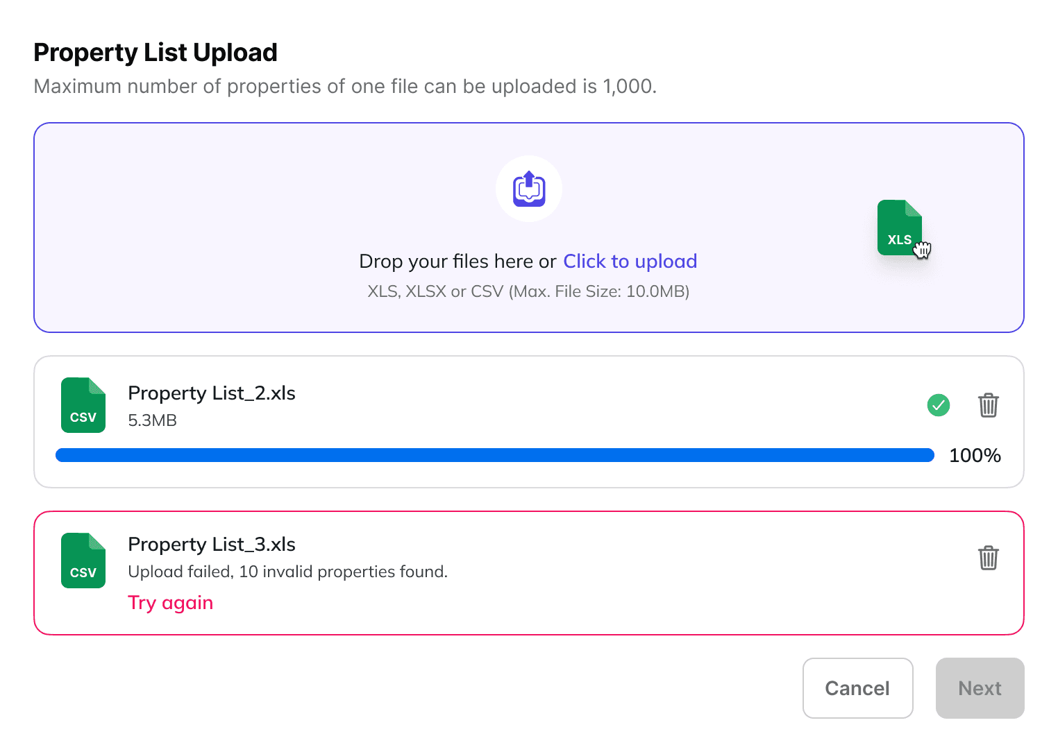 Users can batch upload entries, such as properties, through formats like CSV, Excel, and the system will validate if the uploaded data is in the correct format. If errors are detected, the system will display an error message and prompt users to re-upload the corrected file.